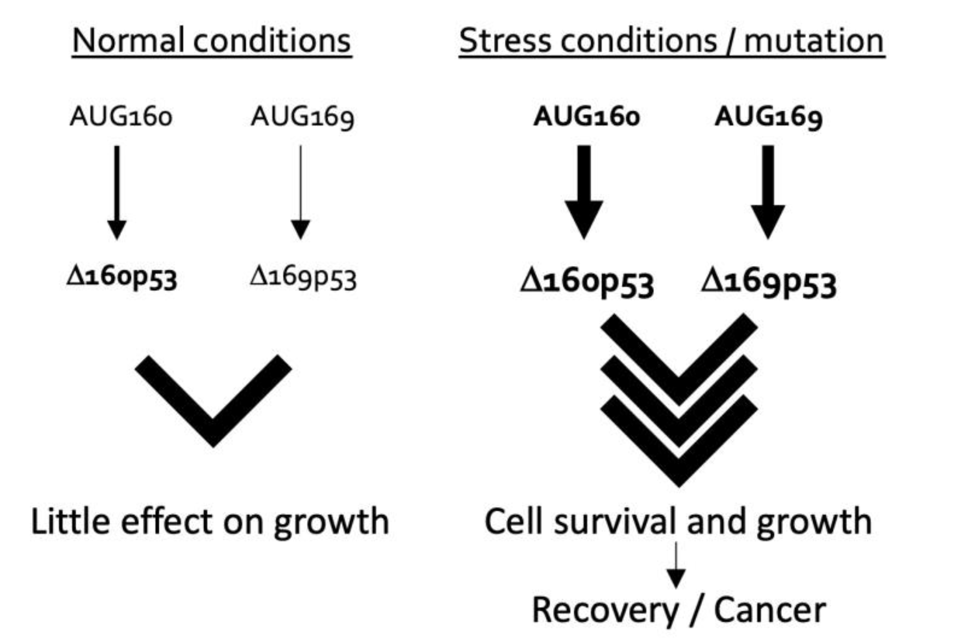 Figure 6C: “Under normal cell growth conditions AUG160 and AUG169 show low activity and there is low expression of the corresponding protein isoforms, but under stress conditions or with mutation each of these individual TIS becomes more active and initiate translation of the two protein forms, D160p53 and D169p53, [which are basically the same and] have equal capacity to induce cell growth and survival, and which could lead to recovery from stress or, in the case of continued activation, cancer formation or cancer development.”
